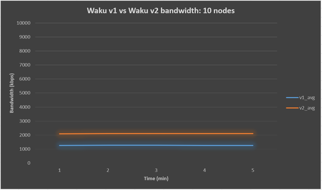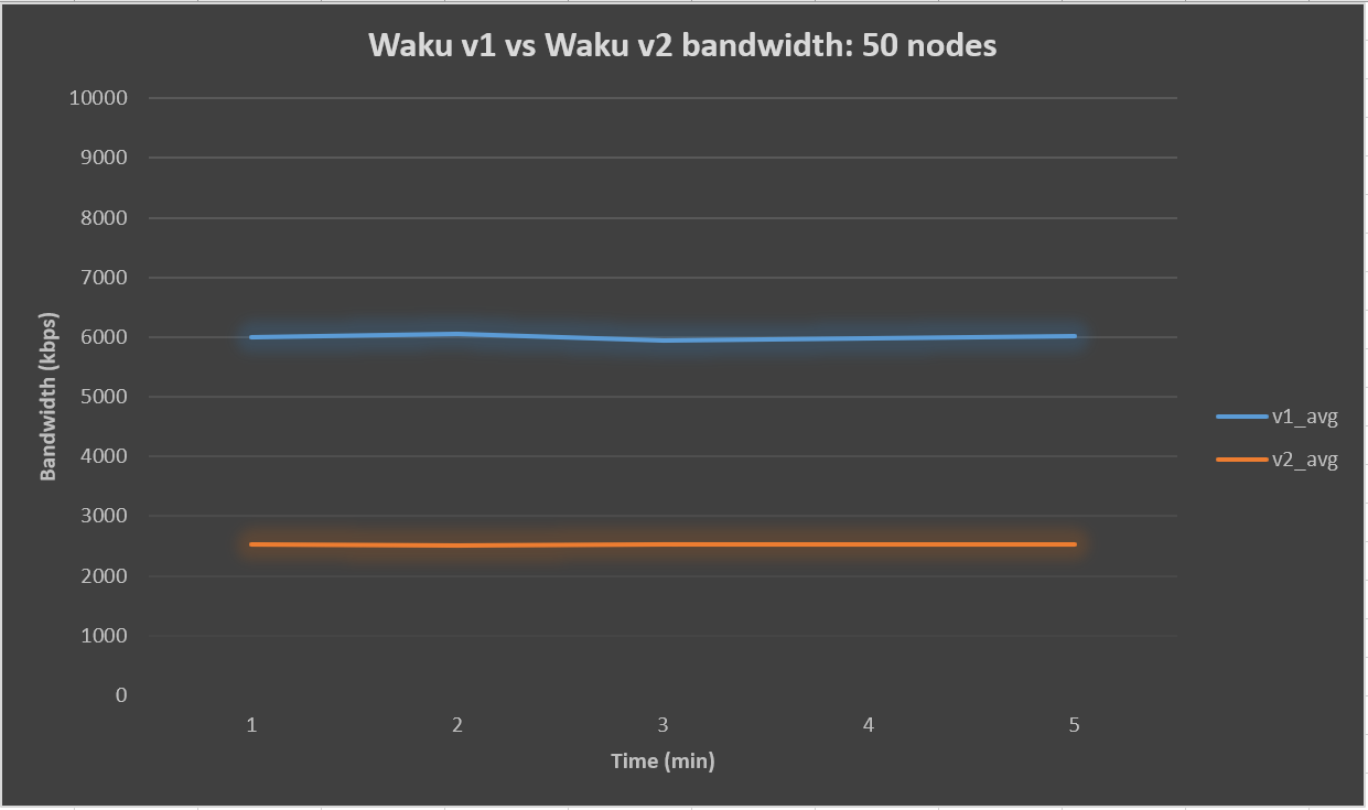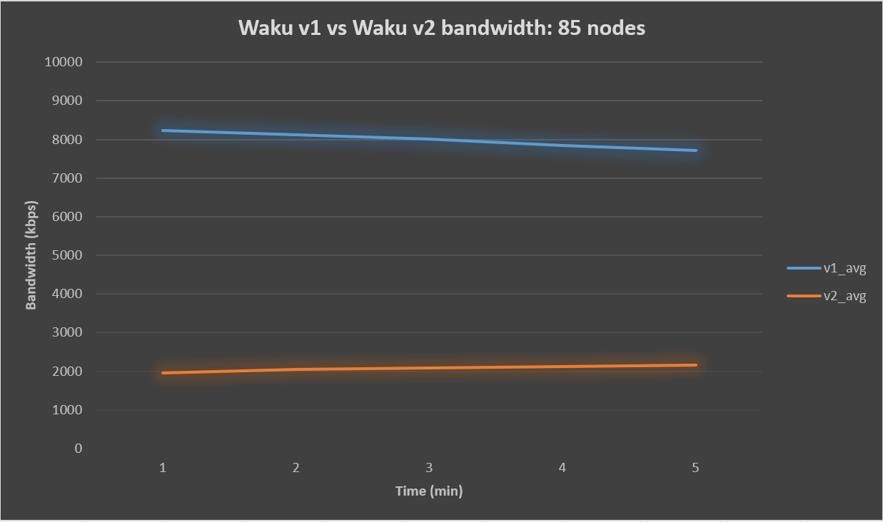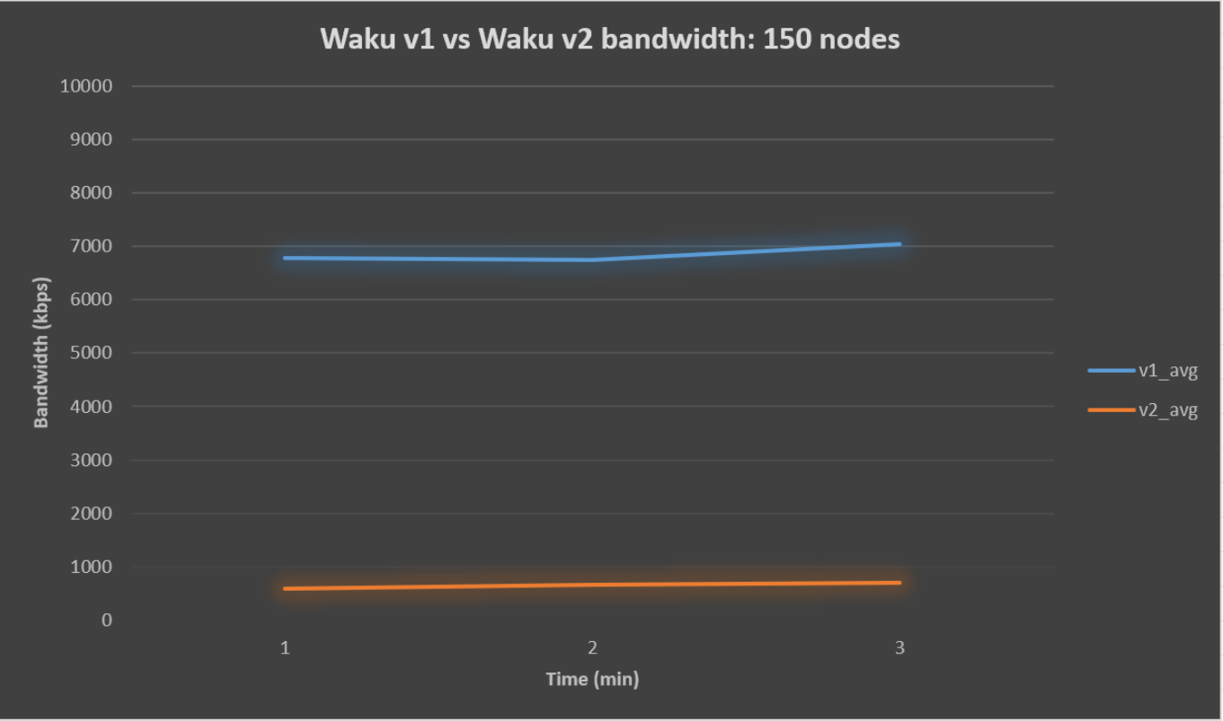 - E.g. for a network consisting of 150 or more densely connected nodes, Waku v2 provides more than 10x better average bandwidth usage rates than Waku v1.