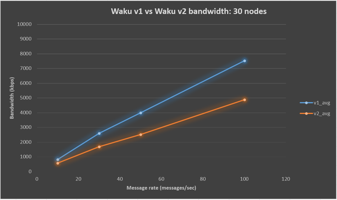 The rate of increase in bandwidth for Waku v2 is slower than that for Waku v1 for a corresponding increase in message propagation rate. In fact, for a network of 30 densely-connected nodes, if the message propagation rate increases by 1 per second, Waku v1 requires an increased average bandwidth of almost 70kbps at each node. A similar traffic increase in Waku v2 requires on average 40kbps more bandwidth per peer, just over half that of Waku v1.